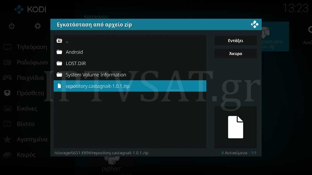 - Ανοίξτε το Kodi στο Android box και ακολουθήστε τη διαδρομή Πρόσθετα -> Εγκατάσταση από αρχείο zip. Εάν σας εμφανιστεί μήνυμα, επιτρέψτε την εγκατάσταση από άγνωστες πηγές.