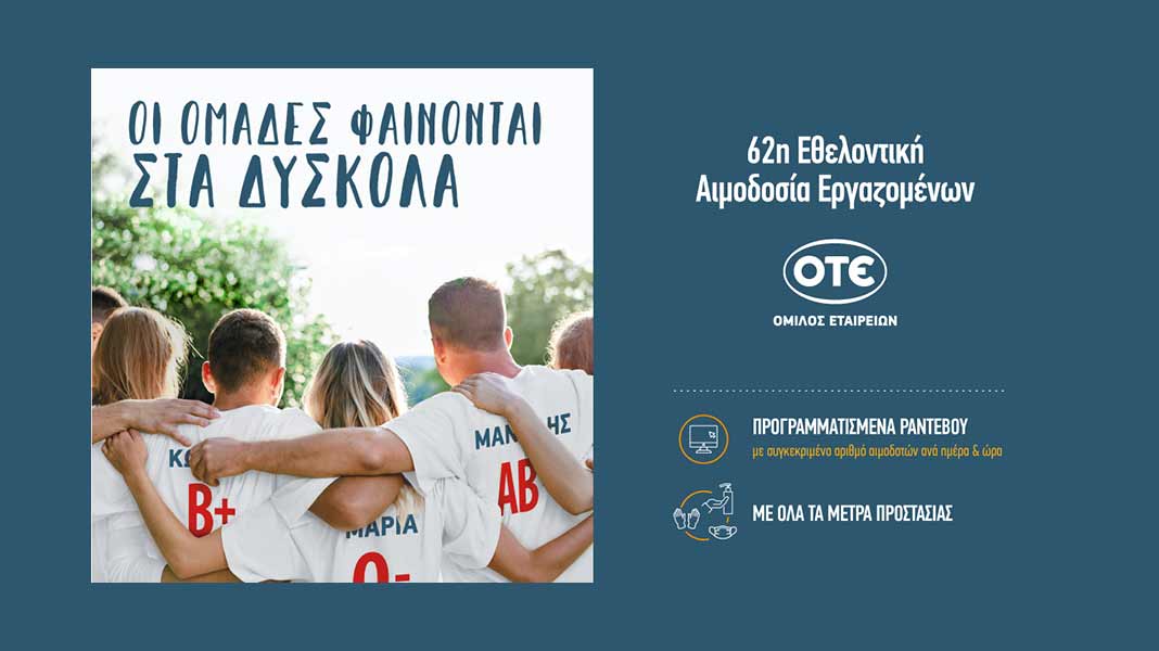 Με κεντρικό μήνυμα «Οι ομάδες φαίνονται στα δύσκολα», οι εθελοντές αιμοδότες του Ομίλου ΟΤΕ συγκέντρωσαν πάνω από 500 φιάλες αίματος στην 62η εθελοντική αιμοδοσία, η οποία πραγματοποιήθηκε στις εγκαταστάσεις του Ομίλου σε Αθήνα και Πάτρα, σε συνεργασία με κρατικά νοσοκομεία. Βάζοντας πάντα σε προτεραιότητα την ασφάλεια των εργαζομένων, το πρόγραμμα της εθελοντικής αιμοδοσίας υλοποιήθηκε αποκλειστικά κατόπιν ραντεβού, για συγκεκριμένο αριθμό αιμοδοτών ανά ημέρα και ώρα και με ειδικά μέτρα προστασίας εξαιτίας της πανδημίας.