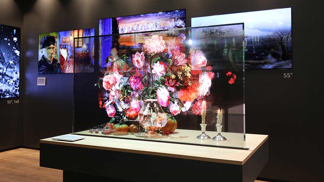 Η Transparent OLED προσφέρει transparency έως 38%, όταν το υψηλότερο ποσοστό που έχει επιτευχθεί είναι 10% με οθόνη LCD. Όταν τη βλέπετε από μπροστά, τα αντικείμενα πίσω από την οθόνη ενσωματώνονται στο περιεχόμενο. Η προστασία κατά της υπεριώδους ακτινοβολίας στο μπροστινό μέρος καθιστά την οθόνη ιδανική για τις βιτρίνες των καταστημάτων που προσελκύουν την προσοχή των περαστικών, καθώς η ευρεία γωνία προβολής σημαίνει ότι οι θεατές μπορούν να βλέπουν περιεχόμενο καθαρά καθώς πλησιάζουν την οθόνη από κάθε πλευρά. Όταν οι θεατές στέκονται ακριβώς μπροστά από την οθόνη, οι εικόνες και το βίντεο επικαλύπτουν απρόσκοπτα τα αντικείμενα πίσω από την οθόνη.
