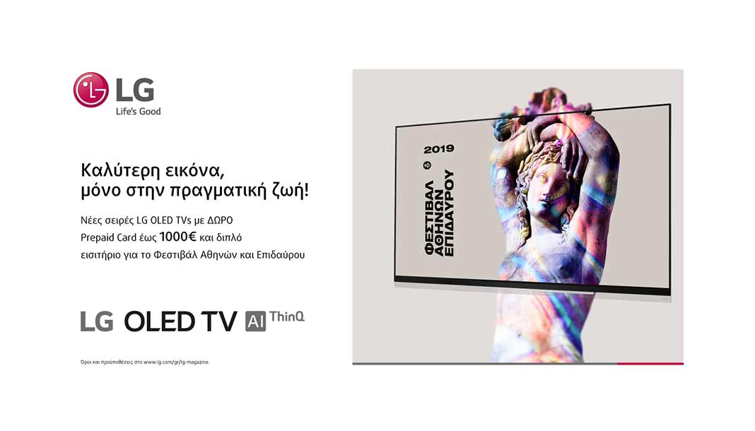 Παράλληλα, από την Κυριακή, 9 Ιουνίου έως και την Κυριακή, 30 Ιουνίου 2019 και μέχρι εξαντλήσεων των αποθεμάτων ή των δώρων, οι καταναλωτές μέσω της προωθητικής ενέργειας της LG θα έχουν τη δυνατότητα να αποκτήσουν μοναδικά δώρα. Συγκεκριμένα, με την αγορά μιας υπερσύγχρονης OLED τηλεόρασης[1], θα λάβουν μια pre-paid κάρτα αξίας έως και €1.000 και ένα διπλό εισιτήριο για το Φεστιβάλ Αθηνών και Επιδαύρου.
