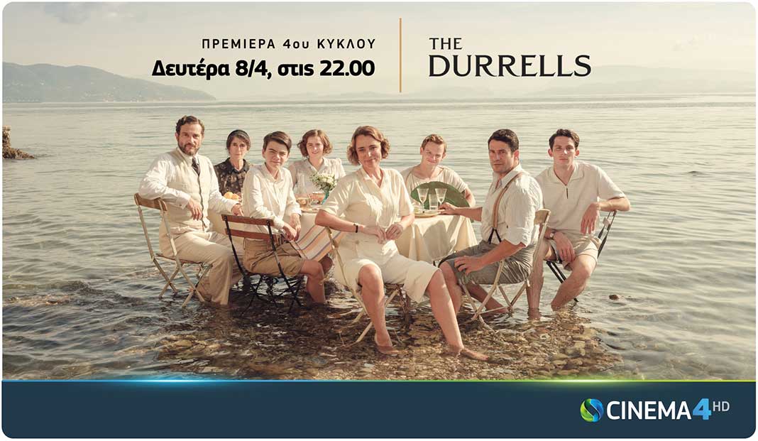 Η 4η και τελευταία σεζόν της γυρισμένης στην Κέρκυρα βρετανικής σειράς The Durrells έρχεται αποκλειστικά στην COSMOTE TV, την Δευτέρα 8 Απριλίου, 24 ώρες μετά την παγκόσμια πρεμιέρα της. Η σειρά θα προβάλλεται στο COSMOTE CINEMA 4HD κάθε Δευτέρα βράδυ στις 22.00, με τα επεισόδια -αμέσως μετά την προβολή τους- να είναι διαθέσιμα και on demand στην υπηρεσία COSMOTE TV PLUS. Όλοι οι προηγούμενοι κύκλοι του The Durrells έχουν «ανέβει» στην υπηρεσία και είναι διαθέσιμοι για θέαση.