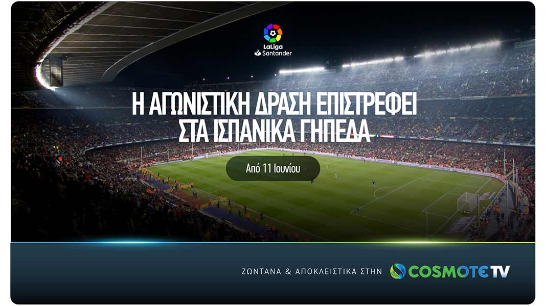 Η La Liga Santander είναι το επόμενο ευρωπαϊκό πρωτάθλημα ποδοσφαίρου που παίρνει τη σκυτάλη της επιστροφής στα γήπεδα, και η δημοσιογραφική ομάδα της COSMOTE TV είναι έτοιμη για τη μετάδοση των πολυαναμενόμενων ματς του ισπανικού πρωταθλήματος, που θα ολοκληρώσουν τη σεζόν 2019-2020, ζωντανά και αποκλειστικά στα κανάλια COSMOTE SPORT HD.