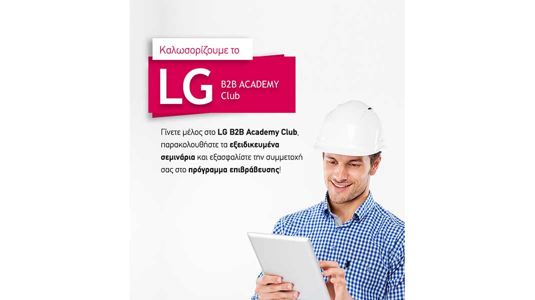 Το επαγγελματικό τμήμα Business Solutions της LG Electronics (LG) επεκτείνει το πλαίσιο δράσης της Β2Β Ακαδημίας γιορτάζοντας τα 10 χρόνια λειτουργίας της και παρουσιάζει το νέο πρόγραμμα επιβράβευσης για εκπαιδευτικά σεμινάρια LG B2B Academy Club αποκλειστικά για τους επαγγελματίες του κλάδου. Τα μέλη του LG B2B Academy Club έχουν τη δυνατότητα να παρακολουθήσουν δωρεάν εκπαιδευτικά σεμινάρια, λαμβάνοντας πιστοποίηση παρακολούθησης ηλεκτρονικά και σύμφωνα με το πρόγραμμα επιβράβευσης, να συλλέξουν πόντους με διάφορες ενέργειες και να κερδίσουν μοναδικά δώρα. Μέσα από τους κύκλους σεμιναρίων οι εξειδικευμένοι εκπαιδευτές της LG μεταδίδουν την τεχνογνωσία της εταιρείας στους επαγγελματίες των σχετικών κλάδων και τους παρέχουν πρακτική εξάσκηση στα LG προϊόντα με τη χρήση των τελευταίων και πιο εξελιγμένων τεχνολογιών και εξοπλισμού.