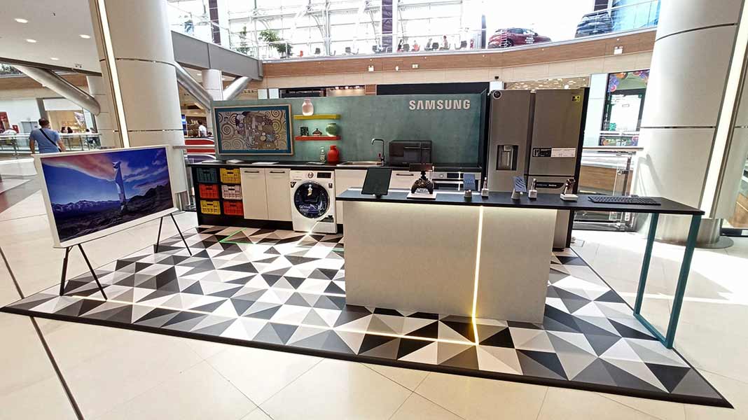 Οι οικιακές συσκευές που βρίσκονται στο booth της Samsung στο The Mall Athens πλαισιώνονται από τις Lifestyle TVs της εταιρείας, The Frame και The Serif.