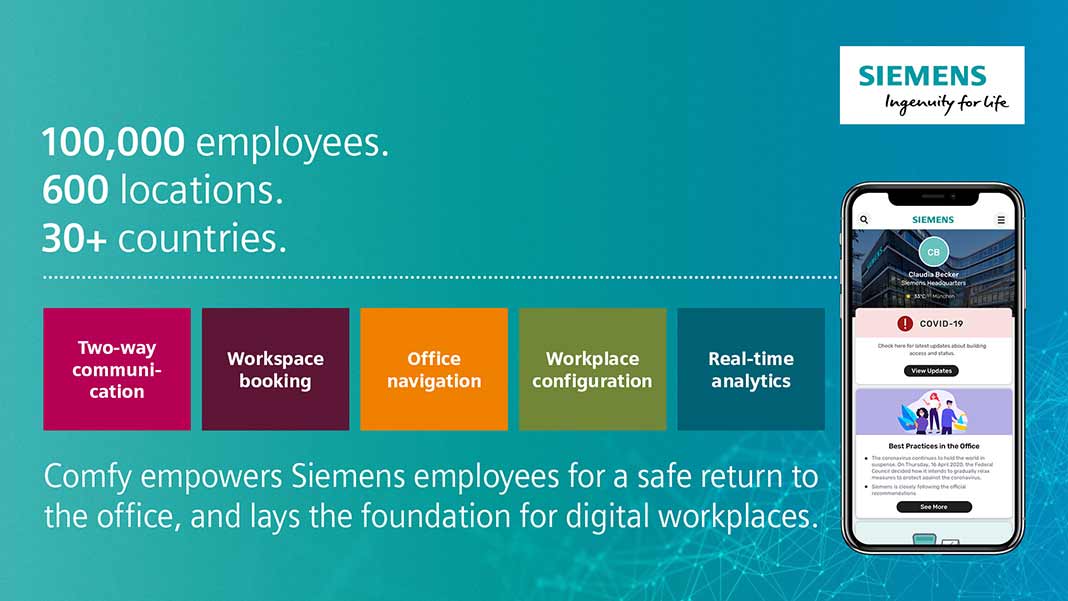 Η Siemens αναπτύσσει τη λύση για αποτελεσματική διαχείριση χώρων εργασίας, Comfy, στα γραφεία της ανά τον κόσμο, στοχεύοντας περίπου 600 εγκαταστάσεις της έως τον Οκτώβριο του τρέχοντος έτους. Αυτό υποστηρίζει την ασφαλή επιστροφή στο χώρο εργασίας για τους εργαζόμενους κατά τη διάρκεια της πανδημίας και θέτει τα θεμέλια για πιο ευέλικτη και επικεντρωμένη στο μέλλον εργασία. Η εφαρμογή Comfy συνδυάζει την τοποθεσία, τη χρήση και τα έξυπνα δεδομένα κτηρίων με ένα ευρύ φάσμα απαιτήσεων των χρηστών ώστε να συνδέει τους εργαζόμενους με το περιβάλλον του γραφείου. Περισσότεροι από 100.000 εργαζόμενοι της Siemens σε 30 χώρες θα έχουν πρόσβαση στην εφαρμογή. Στην πρώτη φάση, μια απλοποιημένη έκδοση θα παρέχει τις σημαντικότερες πληροφορίες για την τοποθεσία από την οποία εργάζεται κάθε υπάλληλος. Αυτό περιλαμβάνει επίσης τις πιο πρόσφατες γενικές και ειδικές ενημερώσεις ανά τοποθεσία για τον COVID-19, καθώς και τους ισχύοντες κανονισμούς υγείας.
