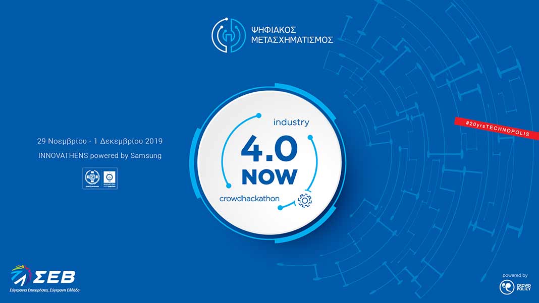 Στις 29, 30 Νοεμβρίου και 1 Δεκεμβρίου 2019, το οικοσύστημα της καινοτομίας, των startups και του πανεπιστημίου συναντά την ελληνική βιομηχανία και μαζί διαμορφώνουν το μέλλον των ελληνικών επιχειρήσεων. Στόχος του industry 4.0 NOW! crowdhackathon είναι το πέρασμα της ελληνικής βιομηχανίας στην ψηφιακή εποχή. Πώς; Με τη συλλογή πληροφοριών από τις συμμετέχουσες επιχειρήσεις όσον αφορά τα προβλήματα που αντιμετωπίζουν  και, στη συνέχεια, με την αξιοποίηση και μετατροπή των πληροφοριών αυτών σε λύσεις που θα βοηθήσουν τις επιχειρήσεις να εξελιχθούν στο πλαίσιο του ψηφιακού μετασχηματισμού.