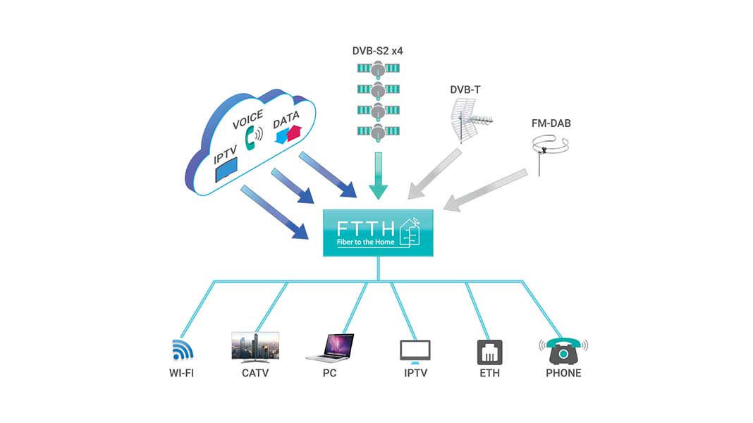 Για παράδειγμα, μία από τις λύσεις περιλαμβάνει GPON + CATV + SAT, όπου εκτός από τις υπηρεσίες IP και τα προγράμματα CATV (DVB-C / T), έχουμε και 4 δορυφορικές πολώσεις (DVB-S / S2). Δύο οπτικά σήματα, ένα από OLT και ένα από οπτικό πομπό, συνδυάζονται χρησιμοποιώντας WDM2 (2-Way Wavelength Division Multiplex) σε μία μόνο οπτική ίνα και στη συνέχεια διαιρούνται με έναν οπτικό splitter μέχρι και 32 φορές. Αυτό επιτρέπει σε όλες τις εισερχόμενες υπηρεσίες και τα προγράμματα καλωδιακής τηλεόρασης / δορυφόρου, να φθάσουν στη συσκευή ONT στις εγκαταστάσεις όπου μετατρέπονται στην αρχική τους μορφή. Όλες οι υπηρεσίες IP είναι διαθέσιμες στις θύρες Ethernet, την έξοδο τηλεφώνου και το WiFi, ενώ όλα τα προγράμματα καλωδιακής τηλεόρασης / δορυφόρου διατίθενται στην ομοαξονική έξοδο, έτοιμα να συνδεθούν στην τηλεόραση ή στον δορυφορικό δέκτη.