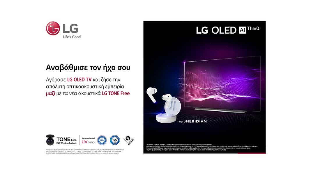 Η LG Electronics (LG) φέρνει την απόλυτη οπτικοακουστική εμπειρία στο σαλόνι σας, μέσα από τη νέα προωθητική της ενέργεια, που υλοποιείται από τις 8 έως και τις 28 Μαρτίου 2021[1].Το συγκεκριμένο διάστημα, οι καταναλωτές θα έχουν τη δυνατότητα να αποκτήσουν δωρεάν τα ασύρματα ακουστικά LG Tone Free FN6, με την αγορά των μοντέλων τηλεοράσεων OLED77GX6LA, OLED77CX6LA, OLED65GX6LA, OLED65CX6LA, OLED65BX6LA, OLED55GX6LA, OLED55CX6LA ή OLED55BX6LA.