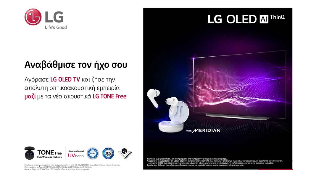 Στην νέα προωθητική ενέργεια της LG Electronics (LG), με την αγορά των μοντέλων τηλεοράσεων OLED77CX6LA, OLED65CX6LA, OLED55CX6LA ή OLED55GX6LA από τις 8 έως και τις 28 Φεβρουαρίου 2021 ή μέχρι εξαντλήσεως των αποθεμάτων, θα μπορούν να αποκτήσουν δωρεάν τα νέα ασύρματα ακουστικά Tone Free FN6.
