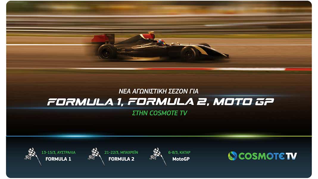 Η νέα αγωνιστική περίοδος των κορυφαίων πρωταθλημάτων μηχανοκίνητου αθλητισμού Formula 1, Formula 2 και MotoGP ξεκινά τον Μάρτιο και οι συνδρομητές της COSMOTE TV θα παρακολουθήσουν όλη τη δράση της νέας σεζόν, στα κανάλια COSMOTE SPORT.