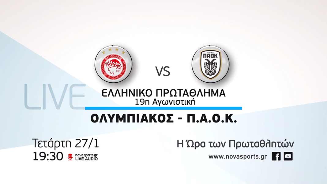 19:30 Ολυμπιακός – ΠΑΟΚ, Novasports1HD και ηχητικά στο Novasports.gr σε περιγραφή του Ισίδωρου Πρίντεζη και του Γρηγόρη Παπαβασιλείου και ρεπορτάζ των Βασίλη Κωνσταντόπουλου, Κωστή Μπότσαρη
