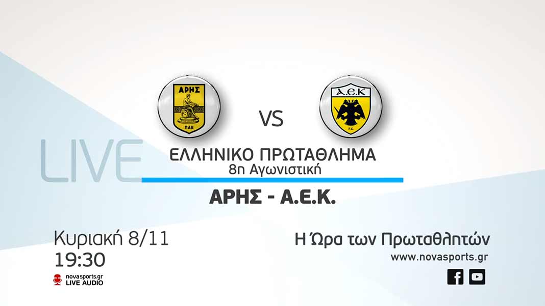 19:30 Άρης – ΑΕΚ, Novasports1HD και ηχητικά στο Novasports.gr σε περιγραφή του Γιάννη Πάγκου και ρεπορτάζ του Ευγένιου Δαδαλιάρα και του Γιώργου Βασιλείου