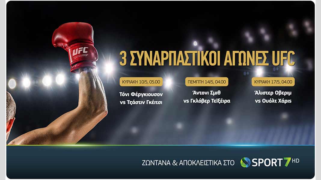 Οι συναρπαστικοί αγώνες του UFC (Ultimate Fighting Championship) συνεχίζονται κανονικά -χωρίς την παρουσία κοινού- και η COSMOTE TV έχει εξασφαλίσει σε ζωντανή αποκλειστική μετάδοση στα κανάλια COSMOTE SPORT HD τις επόμενες 3 πολυαναμενόμενες αναμετρήσεις της διοργάνωσης, για τους φίλους των μαχητικών σπορ. Οι αγώνες θα μεταδοθούν την εβδομάδα 10-17/5 στο COSMOTE SPORT 7HD.