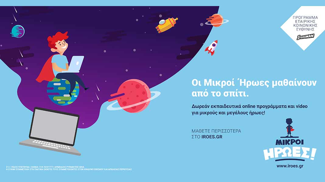 Το πρόγραμμα «Μικροί Ήρωες Μαθαίνουν» προσαρμόζεται πλέον στα νέα δεδομένα και συνεχίζει να στηρίζει την μάθηση των παιδιών, αυτή τη φορά από την ασφάλεια του σπιτιού τους. Καθώς τα μαθήματα και οι εκπαιδευτικές επισκέψεις έχουν διακοπεί λόγω της πανδημίας, η εκπαιδευτική πραγματικότητα που ξεδιπλώνεται απαιτεί μια διαφορετική προσέγγιση. Στο πλαίσιο της εταιρικής υπευθυνότητας, η Stoiximan προχώρησε στην προσαρμογή του προγράμματος των Μικρών Ηρώων, προτείνοντας και παρέχοντας ποιοτικές εκπαιδευτικές δράσεις που μπορούν να πραγματοποιηθούν από το σπίτι.
