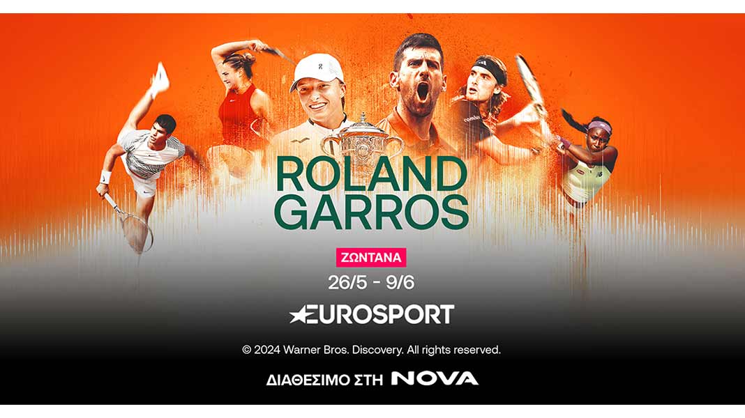 Τα κανάλια Eurosport μεταφέρουν στους φίλους του τένις την απόλυτη εμπειρία του δεύτερου Grand Slam της σεζόν, του 128oυ γαλλικού Roland Garros και οι συνδρομητές της Nova θα έχουν την ευκαιρία να απολαύσουν τη διοργάνωση, που διεξάγεται από την Κυριακή 26 Μαΐου έως και την Κυριακή 9 Ιουνίου στην «Πόλη του Φωτός», στο Παρίσι, με τη συμμετοχή του Στέφανου Τσιτσιπά και της Μαρίας Σάκκαρη.