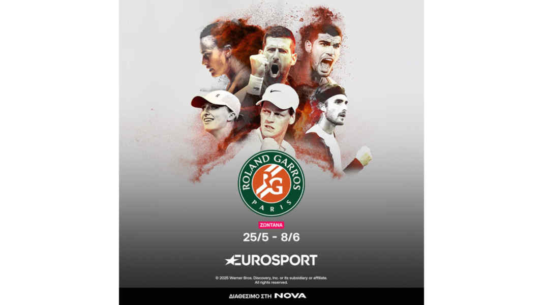 Τα κανάλια Eurosport μεταφέρουν στους φίλους του τένις την απόλυτη εμπειρία του δεύτερου Grand Slam της σεζόν, του 129oυ γαλλικού Roland-Garros και οι συνδρομητές της Nova θα έχουν την ευκαιρία να απολαύσουν τη διοργάνωση, που διεξάγεται από την Κυριακή 25 Μαΐου έως και την Κυριακή 8 Ιουνίου στην «Πόλη του Φωτός», στο Παρίσι, με τη συμμετοχή του Στέφανου Τσιτσιπά και της Μαρίας Σάκκαρη.
