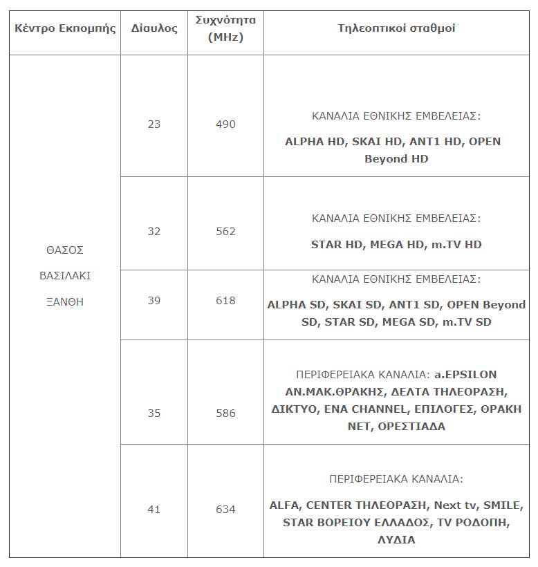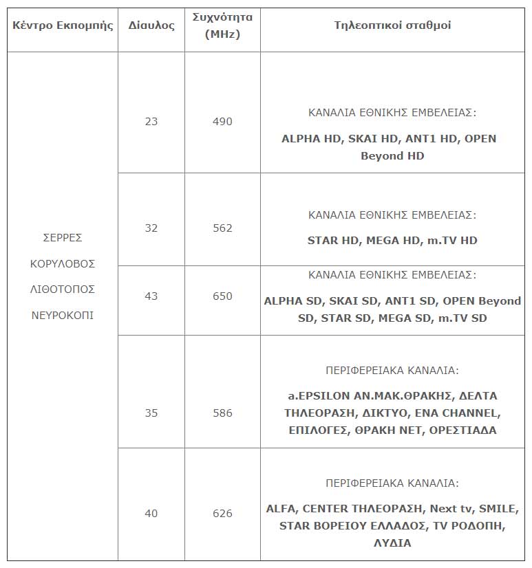 Όσοι κάτοικοι λαμβάνετε επίγειο ψηφιακό σήμα από τα κέντρα εκπομπής που αναφέρονται παρακάτω, θα χρειαστεί στις 26 Φεβρουαρίου 2021 να επανασυντονίσετε τον δέκτη σας (τηλεόραση ή αποκωδικοποιητή), καθώς πλέον το τηλεοπτικό πρόγραμμα θα μεταδίδεται σε νέες συχνότητες. Διαφορετικά θα χάσετε όλα τα κανάλια και θα βλέπετε μαύρο στις οθόνες σας.