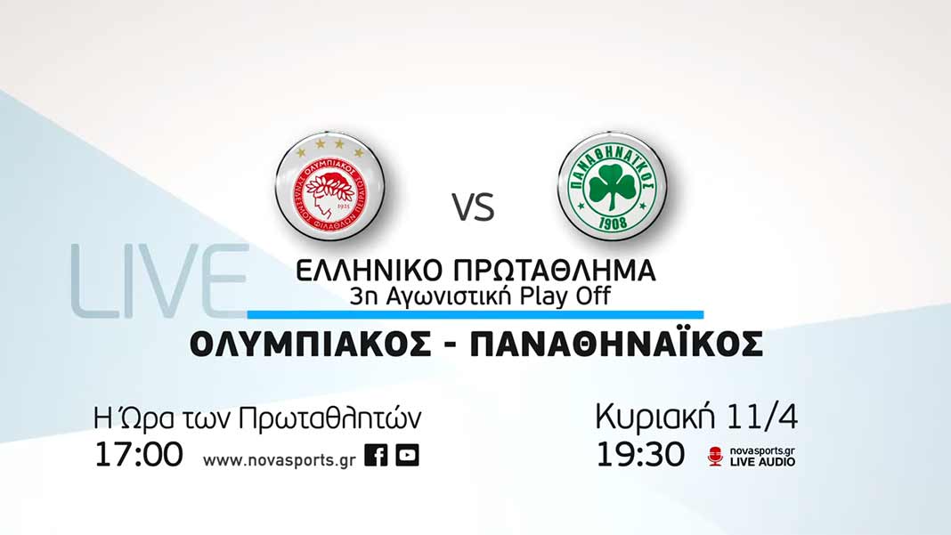 Το «αιώνιο» ντέρμπι του ελληνικού ποδοσφαίρου, η «μονομαχία» των κιτρινόμαυρων στη Θεσσαλονίκη και η «μάχη» της Τρίπολης θα κριθούν στο γήπεδο των καναλιών Novasports! Οι φίλοι του ελληνικού πρωταθλήματος ποδοσφαίρου την Κυριακή 11 Απριλίου θα έχουν την ευκαιρία να παρακολουθήσουν ζωντανά και αποκλειστικά τον αγώνα Άρης – ΑΕΚ (15:00), την αναμέτρηση Αστέρας Τρίπολης – ΠΑΟΚ (17:15) και φυσικά το ελληνικό El Clasico Ολυμπιακός – Παναθηναϊκός (19:30) για την 3η αγωνιστική των Play Off του ελληνικού πρωταθλήματος ποδοσφαίρου.