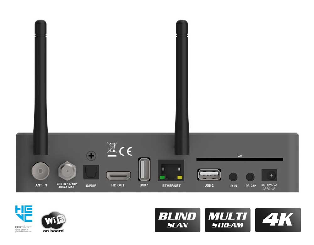 Στη πρόσοψη έχουμε LED Display (Standby, Recording), πλήκτρα Power, Κανάλι +/-, ενώ στη πίσω όψη βρίσκουμε είσοδος LNB, είσοδο RF: 1x IEC-type, HDMI, οπτική έξοδο ψηφιακού ήχου (S/PDIF), 2 x Κεραίες WiFi, 2 x USB 2.0, υποδοχή Smartcard, Ethernet, jack σε RS232, jack σε IR και DC in για το παρεχόμενο εξωτερικό τροφοδοτικό.