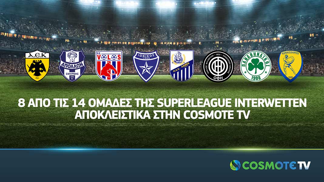 Η νέα σεζόν της Superleague Interwetten ξεκινάει και για πρώτη φορά 8 ελληνικές ομάδες θα παίζουν αποκλειστικά στο «γήπεδο» της COSMOTE TV. Μετά τον Παναθηναϊκό, την ΑΕΚ και τον ΟΦΗ, τα κανάλια COSMOTE SPORT θα μεταδίδουν όλους τους εντός έδρας αγώνες για το Πρωτάθλημα της Superleague Interwetten, τους εντός και εκτός έδρας φιλικούς αγώνες, καθώς και επιλεγμένους αγώνες των Πρωταθλημάτων Υποδομής και των ομάδων του Απόλλωνα Σμύρνης, του Βόλου, του Ιωνικού, της Λαμίας και του Παναιτωλικού. Μέσα από τις συμφωνίες αυτές, περίπου το 60% των αγώνων του ελληνικού πρωταθλήματος ποδοσφαίρου θα μεταδίδεται για τα επόμενα 2 χρόνια αποκλειστικά από την COSMOTE TV.