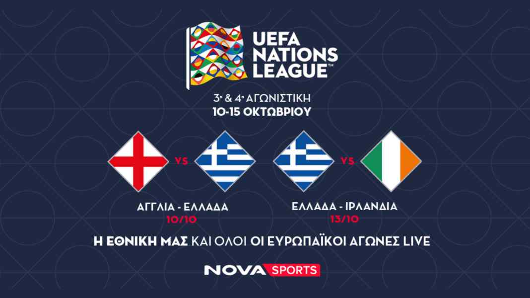 Στο UEFA Nations League η Εθνική μας ομάδα με τον Ιβάν Γιοβάνοβιτς πάγκο μετά το 2Χ2 στις δύο πρώτες αγωνιστικές κόντρα σε Φινλανδία και Ιρλανδία αντιμετωπίζει στο Wembley την Αγγλία (10/10, 21:45) και υποδέχεται στο «Γ. Καραϊσκάκης» την Ιρλανδία (13/10, 21:45) με στόχο να συνεχίσει τα θετικά αποτελέσματα, διεκδικώντας την πρώτη θέση και την άνοδο στη League A που οδηγεί στους τελικούς και στην ελπίδα για εισιτήριο στο Μουντιάλ του 2026. Οι αγώνες της «γαλανόλευκης» θα μεταδοθούν στο Novasports Prime σε περιγραφή του Χρήστου Σωτηρακόπουλου, σχόλιο του Ντέμη Νικολαιδη.