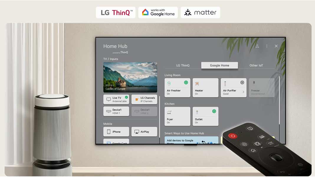 Το νέο, εξειδικευμένο πλήκτρο άμεσης πρόσβασης στο Home Hub μετατρέπει το AI Magic Remote σε κέντρο ελέγχου του έξυπνου σπιτιού σας. Η πλατφόρμα Home Hub, σχεδιασμένη ως μια ολοκληρωμένη «all-in-one» εμπειρία, σας επιτρέπει να διαχειρίζεστε εύκολα οικιακές συσκευές LG, καθώς και συσκευές Google Home και άλλες συμβατές λύσεις.[6]