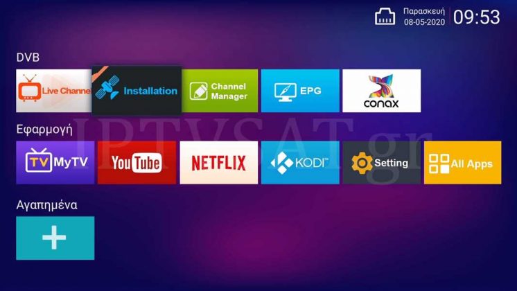Με το πλήκτρο Home (εικονίδιο οικίας), εμφανίζεται η βασική κάρτα επιλογών, με ευχάριστα γραφικά. Στην εν λόγω κάρτα, βρίσκουμε τις βασικές επιλογές χωρισμένες σε 2 κατηγορίες DVB και Εφαρμογή. Στη πρώτη κατηγορία, βρίσκουμε όλες τις επιλογές για τη λήψη καναλιών και συγκεκριμένα Live Channel, Installation, Channel Manager, EPG και Conax, ενώ στη δεύτερη κατηγορία έχουμε τις επιλογές MyTV, YouTube, NETFLIX, KODI, Setting και All Apps.