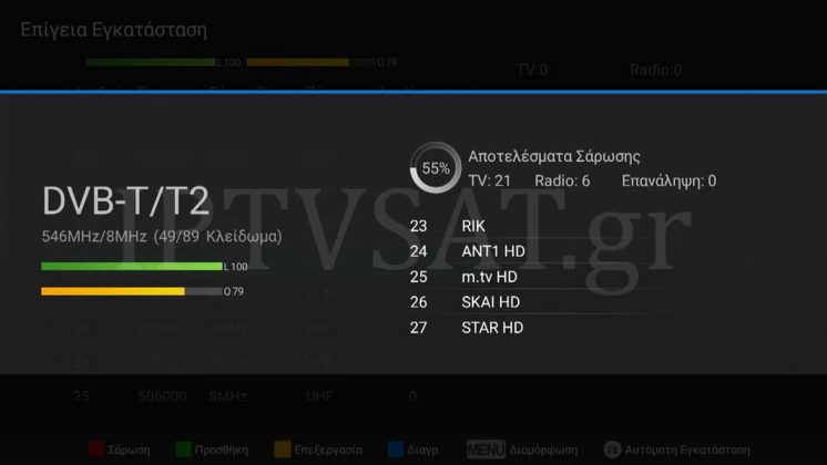 Η διαχείριση των επίγειων καναλιών είναι αρκετά πιο απλή, καθώς αρκεί να πλοηγηθείτε στη διαδρομή DVB->Installation->Επίγεια Εγκατάσταση και να πατήσετε το πλήκτρο F1 για αυτόματη σάρωση. Καλό είναι να πατήσετε MENU για να απενεργοποιήσετε την τροφοδοσία tuner, εάν δεν τη χρειάζεστε. Σύντομα, θα έχετε όλα τα διαθέσιμα επίγεια ψηφιακά κανάλια στον δέκτη, έτοιμα προς τηλεθέαση, ενώ να σημειωθεί ότι οι μπάρες σήματος για κάθε συχνότητα είναι πάντα παρούσες, για επιβεβαίωση σήματος και χειροκίνητη ανίχνευση με το κόκκινο πλήκτρο. Επίσης, έχετε στη διάθεσή σας έναν άριστο ελληνικό ηλεκτρονικό οδηγό προγράμματος, με πλήρεις δυνατότητες, όπως πχ χρονοπρογραμματισμό εγγραφών με το πράσινο πλήκτρο