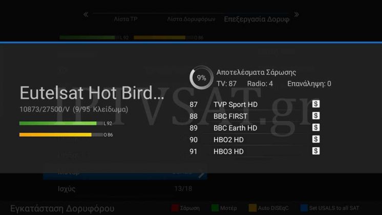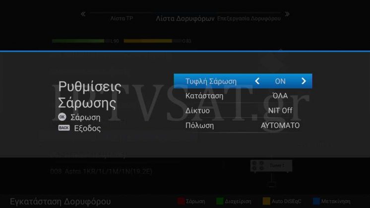 Στη διαδρομή DVB->Installation->Εγκατάσταση Δορυφόρου, έχουμε τις λειτουργίες σεταρίσματος για τον δορυφορικό δέκτη, όπου θα βρείτε 96 προ-εγκατεστημένους δορυφόρους, τους οποίους μπορείτε να τροποποιήσετε, αλλά και να προσθέσετε νέους. Στην αντίστοιχη κάρτα που εμφανίζεται, έχετε τις επιλογές Λίστα TP , Λίστα Δορυφόρων και Επεξεργασία Δορυφόρου. Στη τελευταία επιλογή, σετάρουμε κυρίως τη σηματοδοσία DiSEqC 1.0, 1.1 και μοτέρ DiSEqC 1.2/USALS, ανάλογα με την εγκατάστασή μας. Να σημειωθεί ότι οι 3 παραπάνω επιλογές πραγματοποιούνται με τα πλήκτρα << >> του τηλεχειριστηρίου, όπως και πολλές άλλες επιλογές. Οι μπάρες σήματος είναι πάντα παρούσες διευκολύνοντας τις ρυθμίσεις μας, ενώ με το κόκκινο πλήκτρο πραγματοποιούμε ανίχνευση καναλιών, με δυνατότητα «Τυφλή Σάρωση» (blind scan), NIT, καθώς και μόνο των ελεύθερων εάν επιθυμούμε.
