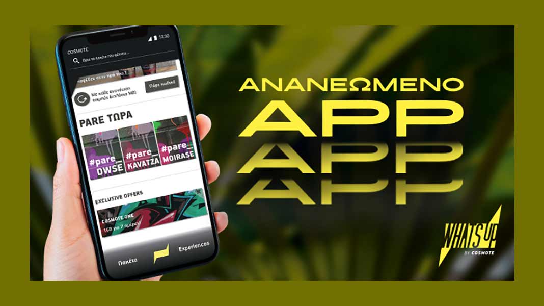 Το ανανεωμένο app του WHAT’S UP της COSMOTE γίνεται ακόμα πιο εύχρηστο για τους συνδρομητές με φρέσκια αισθητική, εύκολη πρόσβαση στις υπηρεσίες και νέες δυνατότητες για τους συνδρομητές. Με πάνω από 1,6 εκατ. ενεργούς χρήστες κάθε μήνα, το WHAT’S UP app αποτελεί τη νούμερο ένα εφαρμογή τηλεπικοινωνιών, καθώς είναι ένα σύγχρονο ψηφιακό εργαλείο, για τη διαχείριση και την κάλυψη κάθε ανάγκης των νέων, για επικοινωνία.