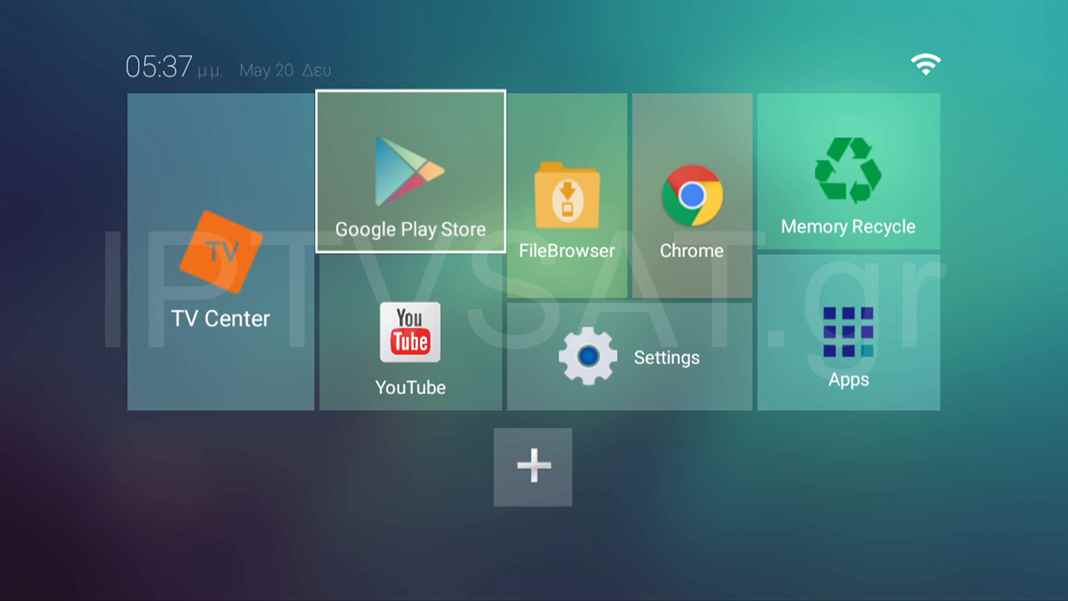 Ο Launcher περιλαμβάνει τις κύριες επιλογές, οι οποίες είναι οι: TV Center, Google Play Store, FileBrowser, Chrome, Memory Recycle, YouTube, Settings και Apps, ενώ με το εικονίδιο +, μπορούμε να προσθέσουμε στην αρχική οθόνη κάποια κατ’ επιλογή apps που χρησιμοποιούμε συχνά.