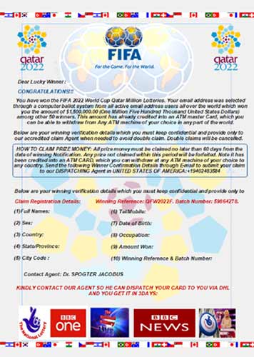 Ένα χαρακτηριστικό σημάδι ότι κάτι δεν πάει καλά είναι ο τίτλος του email. Οι γραμμές του θέματος του ηλεκτρονικού ταχυδρομείου, δεν είναι πολύ δημιουργικές – σκεφτείτε “Νικητής στην κλήρωση Qatar World Cup 2022″, “Νικητής στην κλήρωση QATAR 2022 FIFA” ή “Συγχαρητήρια κερδίσατε στην κλήρωση QATAR FIFA 2022 MEGA WORLD CUP LOTTERY. Από την άλλη, μπορούν σίγουρα να τραβήξουν την προσοχή και να τονώσουν τις ελπίδες κάποιου.