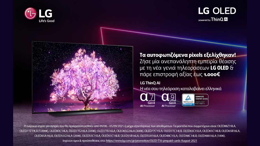 Μια νέα προωθητική ενέργεια παρουσιάζει η LG Electronics (LG), προσφέροντας μία prepaid κάρτα αξίας έως και 1.000€ για όσους αποκτήσουν μια LG OLED TV από τις 09/08 έως τις 05/09 ή μέχρι εξαντλήσεως των αποθεμάτων.