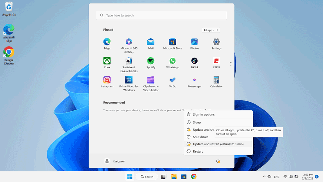 Τέλος, μια συμβουλή μπόνους από τους ειδικούς της ESET! Μην αφήνετε τον υπολογιστή σας να τρέχει για μέρες ασταμάτητα μόνο και μόνο επειδή νομίζετε ότι θα χρειαστεί πολύ ώρα για να ξεκινήσει. Αντ’ αυτού, μπορείτε να τον αφήσετε να περάσει σε κατάσταση Αναστολής Λειτουργίας (Sleep) αντί να τον κλείσετε, αλλά φροντίστε να κάνετε επανεκκίνηση κάθε δύο ή τρεις ημέρες. Σε αντίθεση με ό,τι μπορεί να νομίζετε, η απενεργοποίηση του υπολογιστή δεν κλείνει όλες τις διεργασίες που εκτελούνται, ενώ η επανεκκίνηση του υπολογιστή σας θα τον οδηγήσει να κάνει όλες τις απαραίτητες εγκαταστάσεις και ενημερώσεις και θα κλείσει όλες τις εφαρμογές.