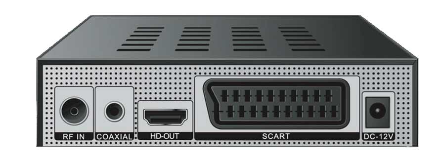 Στην πίσω όψη έχουμε την είσοδο κεραίας, ομοαξονική έξοδο ψηφιακού ήχου S/PDIF, υποδοχή SCART για παλαιότερες τηλεοράσεις και την υποδοχή για το παρεχόμενο εξωτερικό τροφοδοτικό 12V.