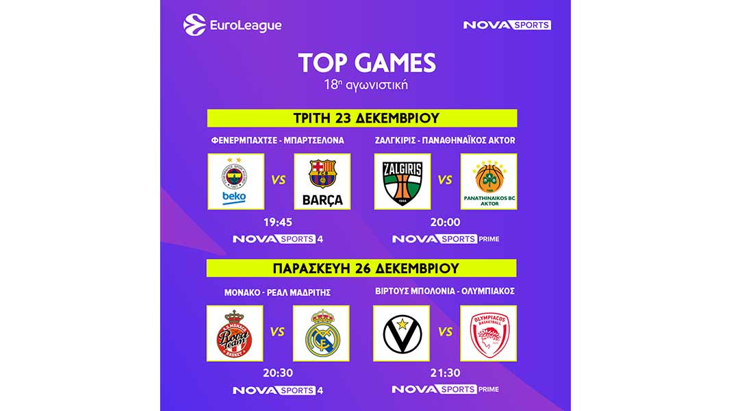Αρχικά η 18η αγωνιστική θα διεξαχθεί την Τρίτη 23 Δεκεμβρίου και την Παρασκευή 26 Δεκεμβρίου με το ενδιαφέρον να στρέφεται στην αποστολή του Παναθηναϊκού AKTOR στο Κάουνας κόντρα στην Ζάλγκιρις(23/12, 20:00), ενώ ο Ολυμπιακός θα ταξιδέψει στην Μπολόνια για την αναμέτρηση απέναντι στη Βίρτους(26/12, 21:30). Και το νέο έτος μπαίνει πολύ δυναμικά στην EuroLeague με την 19η αγωνιστικήκαι το απόλυτο ελληνικό ντέρμπι «αιωνίων» Παναθηναϊκός AKTOR – Ολυμπιακός (2/1, 21:15) που θα διεξαχθεί στο κλειστό του ΟΑΚΑ.