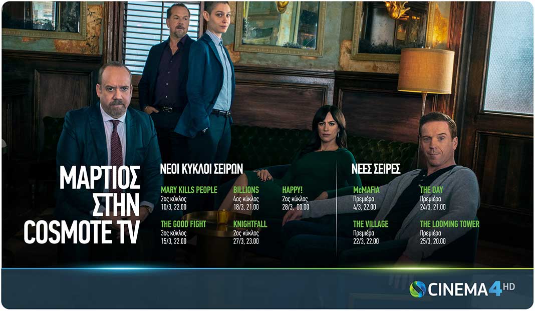 Στις πρεμιέρες του μήνα ξεχωρίζει ο πολυαναμενόμενος 4ος κύκλος της δραματικής σειράς Billions, με το πρωταγωνιστικό δίδυμο Πολ Τζιαμάτι (υποψήφιος για OSCAR®, βραβευμένος με Emmy και Χρυσή Σφαίρα) και Ντέμιαν Λιούις (βραβευμένος με Emmy και Χρυσή Σφαίρα). Στον νέο κύκλο του επιτυχημένου πολιτικού δράματος, οι δύο πρώην θανάσιμοι εχθροί, ο πολιτικά δικτυωμένος εισαγγελέας των ΗΠΑ, Τσακ Ρόουντς (Πολ Τζιαμάτι) και ο καιροσκόπος δισεκατομμυριούχος βασιλιάς των αμερικανικών hedge funds, Μπόμπι «Axe» Άξελροντ (Ντέμιαν Λιούις), συμμαχούν ενάντια στους κοινούς τους εχθρούς. Η σειρά κάνει πρεμιέρα την Δευτέρα 18/3 στις 21.00, 24 ώρες μετά την Αμερική. Οι τρεις προηγούμενοι κύκλοι της σειράς είναι διαθέσιμοι on demand στην υπηρεσία COSMOTE TV PLUS.