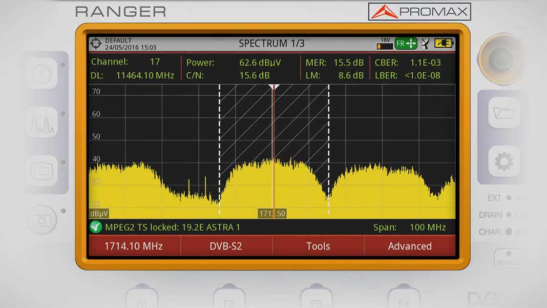 Για να πραγματοποιήσει μια μέτρηση όπως περιγράφηκε παραπάνω, η PROMAX έχει εφαρμόσει εξελιγμένους αλγορίθμους για την επεξεργασία ψηφιακού σήματος, προκειμένου να επιτευχθεί ένα γρήγορο και ακριβές φάσμα στο πεδίο συχνοτήτων. Αυτό το φάσμα είναι το βασικό εργαλείο μέτρησης LEVEL, POWER και C/N με την ακρίβεια και την ταχύτητα που μπορούν να μετρήσουν μόνο τα πεδιόμετρα της Promax, τα οποία διαθέτουν μια μεγάλη ποικιλία φίλτρων ανάλυσης που μπορεί να εφαρμόσει ο χρήστης προκειμένου να αντιμετωπίσει πολλές συγκεκριμένες καταστάσεις.