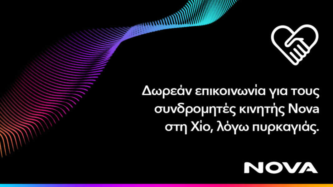 Η Nova, μέλος της United Group, του κορυφαίου παρόχου τηλεπικοινωνιών και Media στη Νοτιοανατολική Ευρώπη, κατανοώντας τις αυξημένες ανάγκες επικοινωνίας, λόγω της καταστροφικής πυρκαγιάς στο νησί της Χίου, ενημερώνει τους συνδρομητές της ότι βρίσκεται κοντά τους παρέχοντας δωρεάν υπηρεσίες επικοινωνίας.