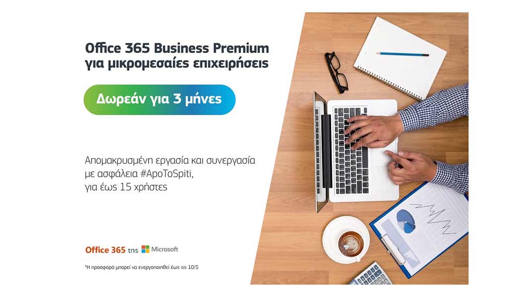 Έως και τις 10/5 οι επιχειρήσεις μπορούν να αποκτήσουν την υπηρεσία Microsoft Office 365 Business Premium δωρεάν για 3 μήνες, συμπληρώνοντας τη φόρμα εκδήλωσης ενδιαφέροντος: εδώ.