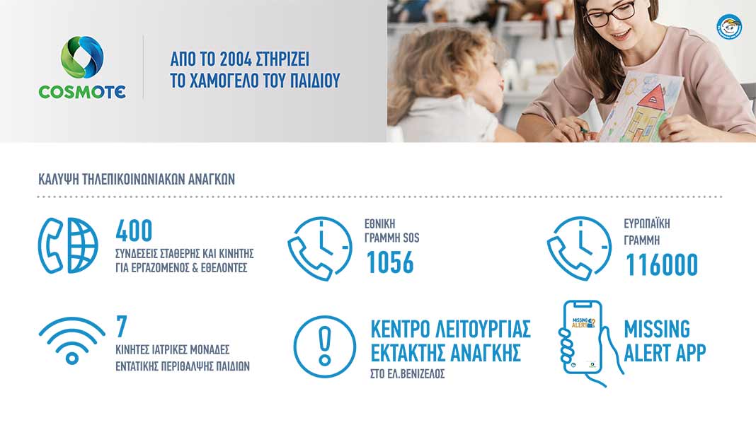 Δεκαεφτά χρόνια η COSMOTE υποστηρίζει το έργο του Οργανισμού «Το Χαμόγελο του Παιδιού», προσφέροντας προηγμένες τεχνολογικές λύσεις και τηλεπικοινωνιακές υπηρεσίες, που διευκολύνουν το έργο του σωματείου για την φροντίδα των παιδιών και την αντιμετώπιση περιστατικών εξαφάνισης στην Ελλάδα.