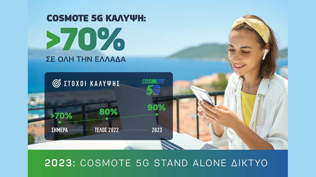 Ξεπέρασε το 70% η πανελλαδική πληθυσμιακή κάλυψη του COSMOTE 5G, του μεγαλύτερου 5G δικτύου της χώρας. Μέχρι το τέλος του 2022, η πληθυσμιακή κάλυψη θα φθάσει το 80% στην ελληνική επικράτεια, ενώ νέος φιλόδοξος στόχος για το τέλος του 2023 είναι το 90%. Επιπλέον, στα τέλη της επόμενης χρονιάς, θα ξεκινήσει κι η λειτουργία του 5G Stand Alone (SA), του επόμενου σταδίου ανάπτυξης του δικτύου 5ης γενιάς.