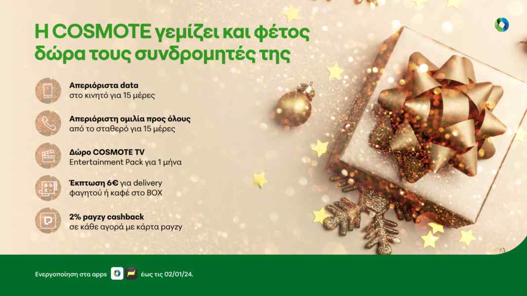 Δωρεάν απεριόριστα data, δωρεάν απεριόριστες κλήσεις από το σταθερό, δωρεάν COSMOTE TV, έκπτωση για παραγγελίες φαγητού στο ΒΟΧ αλλά και επιπλέον cashback για αγορές με payzy, προσφέρει η COSMOTE και φέτος τα Χριστούγεννα σε όλους τους συνδρομητές της. Έως και τις 2 Ιανουαρίου 2024 οι συνδρομητές της εταιρείας μπορούν να ενεργοποιήσουν όποιο από τα δώρα θέλουν, οποιαδήποτε στιγμή το επιθυμούν. Οι συνδρομητές μπορούν να ενημερώνονται για τις προσφορές και να τις ενεργοποιούν, εύκολα και γρήγορα, στο COSMOTE app και το WHAT’S UP app[1].