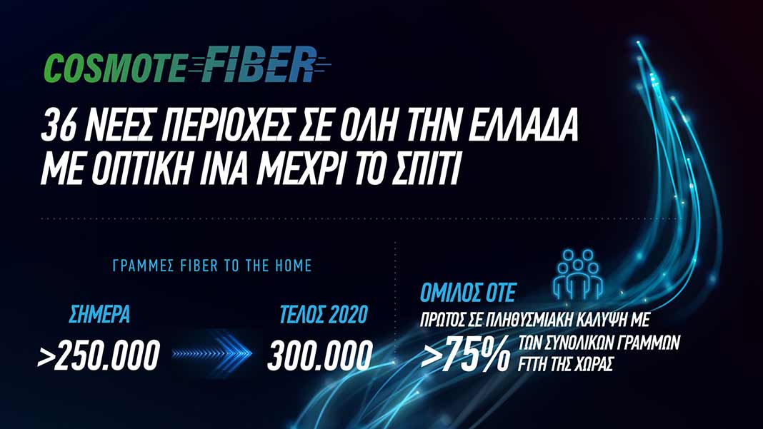 Τριάντα έξι νέες περιοχές σε όλη την Ελλάδα έχουν πλέον πρόσβαση σε 100% οπτική ίνα μέχρι το σπίτι (FTTH) μέσω του COSMOTE Fiber[1], του μεγαλύτερου δικτύου οπτικών ινών στη χώρα. Από την αρχή της χρονιάς μέχρι σήμερα, έχουν προστεθεί περισσότερες από 100.000 νέες γραμμές FTTH, μια αύξηση 70% σε σχέση με τα τέλη του 2019, παρά τις δυσκολίες στην ανάπτυξη δικτύων λόγω της πανδημίας. Στο σύνολο της επικράτειας, τα νοικοκυριά και οι επιχειρήσεις που έχουν πλέον πρόσβαση στις απεριόριστες δυνατότητες της οπτικής ίνας μέχρι το σπίτι, ξεπερνούν τις 250.000.