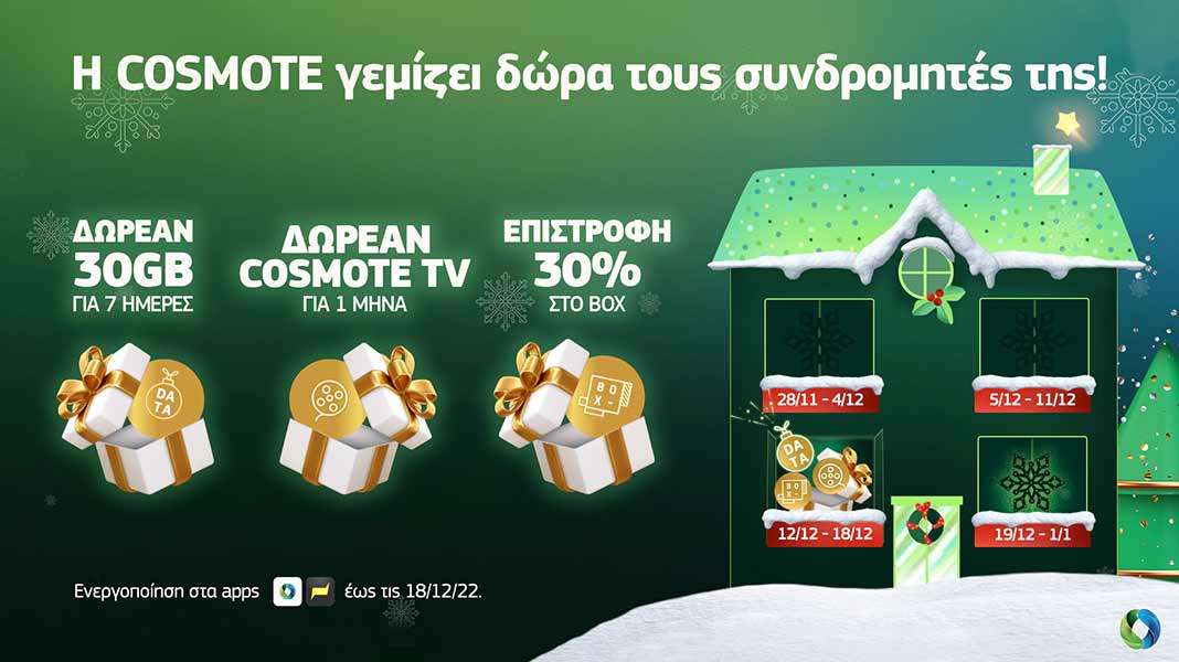 Συνεχίζονται για τρίτη εβδομάδα τα χριστουγεννιάτικα δώρα της COSMOTE στους συνδρομητές της. Αυτή την εβδομάδα όλοι οι συνδρομητές κινητής COSMOTE -οικιακοί και εταιρικοί- έχουν στη διάθεσή τους εντελώς δωρεάν 30GB, για επτά ημέρες από την ενεργοποίηση του πακέτου, είτε για να τα χρησιμοποιήσουν οι ίδιοι, είτε να τα προσφέρουν στους αγαπημένους τους. Επιπλέον, μπορούν να ενεργοποιήσουν δωρεάν COSMOTE TV για ένα μήνα ή να πάρουν 30% επιστροφή της αξίας της παραγγελίας σε πόντους BΟΧ.