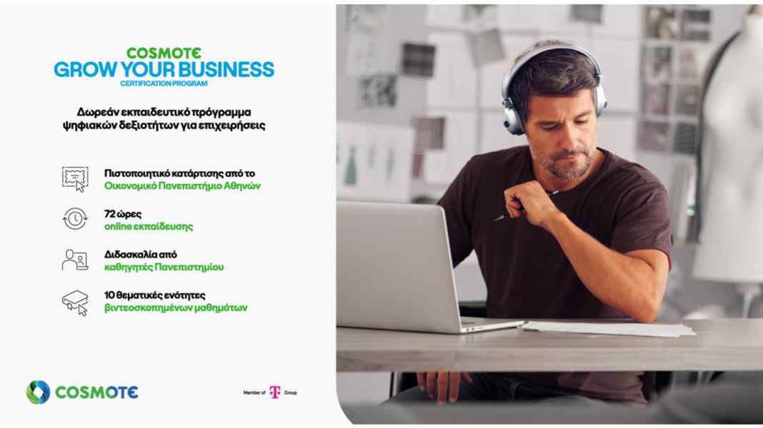 Το δωρεάν εκπαιδευτικό πρόγραμμα ψηφιακών δεξιοτήτων για επιχειρήσεις, COSMOTE GROW YOUR BUSINESS – Certification Program, επιστρέφει για τρίτη συνεχή χρονιά, αυτή τη φορά με την μορφή βιντεοσκοπημένων online μαθημάτων. Τo πρόγραμμα απευθύνεται σε όλες τις μικρομεσαίες επιχειρήσεις, τους εργαζομένους τους και τους ελεύθερους επαγγελματίες και απαντά στην ανάγκη τους για εκπαίδευση και κατάρτιση στα ψηφιακά εργαλεία που θα τις οδηγήσουν στη νέα ψηφιακή εποχή.