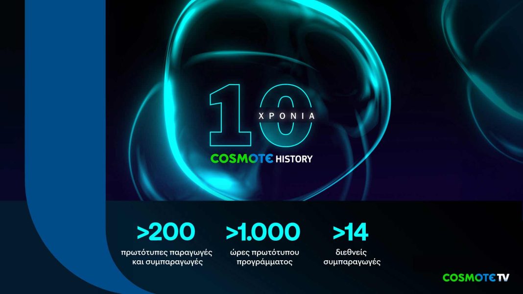 Με αφορμή τη συμπλήρωση των 10 ετών λειτουργίας, το COSMOTE HISTORY παρουσιάζει ένα διμηνιαίο επετειακό πρόγραμμα, (έναρξη τον Φεβρουάριο) με επιλεγμένες παραγωγές και συμπαραγωγές της COSMOTE TV. Το πρόγραμμα περιλαμβάνει καθημερινές προβολές (22:00) δημοφιλών σειρών ντοκιμαντέρ, όπως«Η αύρα της Προεδρικής Φρουράς», «Underwonder» και«Στρατηγική: Από τον Δούρειο Ίππο στην Τεχνητή Νοημοσύνη». Παράλληλα, οι Κυριακές είναι αφιερωμένες σε εμβληματικές ταινίες παραγωγής COSMOTE TV, όπως «Όταν ο Ερμής κράτησε την αναπνοή του» και«Οι πειρατές της Γραμβούσας». Μέσα από την επετειακή θεματική ενότητα (ribbon) «10 χρόνια COSMOTE History» οι τηλεθεατές θα έχουν την ευκαιρία να θυμηθούν 10 σειρές ντοκιμαντέρ, που σημάδεψαν τη δεκαετή πορεία του καναλιού, όπως οι «Σκοτεινοί θάνατοι στην αρχαιότητα», «Καποδίστριας», «Η Γενιά του ’30», «Σωσμένα» και «Μηχανή του Χρόνου».