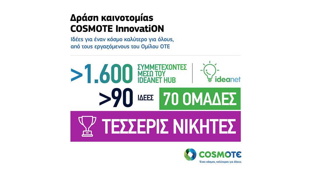 Τέσσερις καινοτόμες ιδέες που θα συμβάλλουν σε έναν κόσμο καλύτερο για όλους και αναμένεται να υλοποιηθούν από την COSMOTE, ανέδειξε η εσωτερική ψηφιακή δράση καινοτομίας InnovatiON, που πραγματοποιήθηκε στον Όμιλο ΟΤΕ. Πρόκειται για την εξέλιξη του Internal Hackathon του Ομίλου που αναζητούσε έξυπνες λύσεις στο νέο περιβάλλον που διαμόρφωσε ο COVID-19. Συνολικά, πάνω από 1.600 εργαζόμενοι κατέθεσαν ή στήριξαν, περισσότερες από 90 ιδέες καινοτομίας για να απλοποιήσουν την καθημερινότητα πελατών κι εργαζομένων, να δημιουργήσουν μοναδικές ψηφιακές εμπειρίες στους πελάτες, να βρουν λύση σε κάποιο κοινωνικό ή περιβαλλοντικό πρόβλημα, ή να προτείνουν ιδέες για την ψηφιακή αγορά του μέλλοντος (Market 4.0).