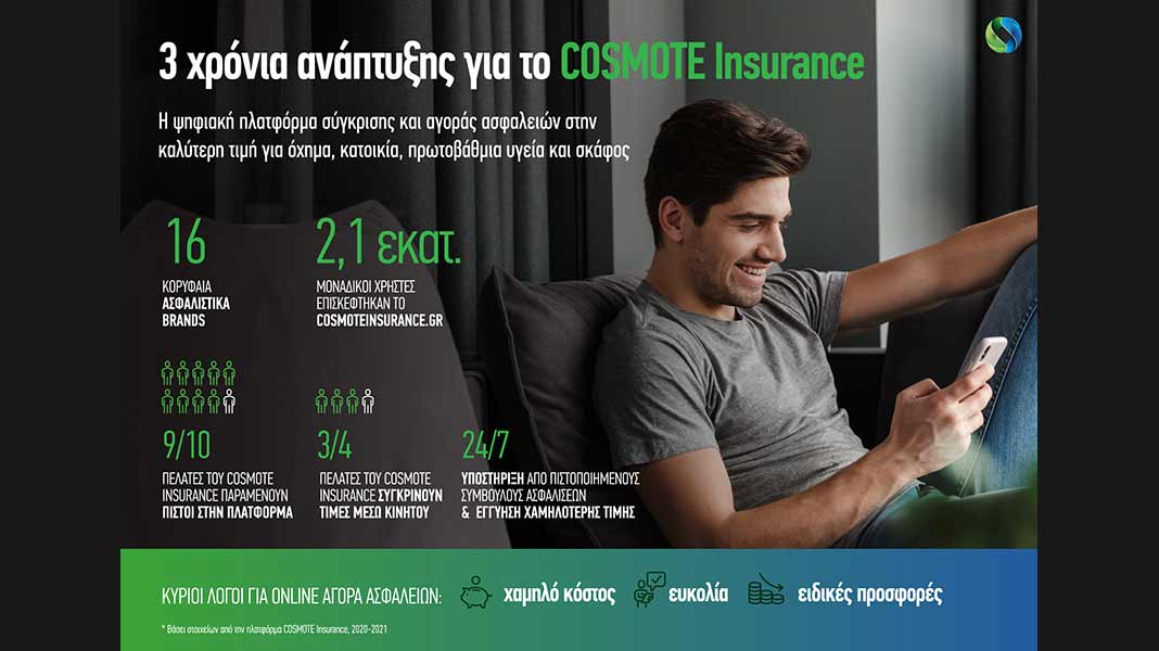 3 χρόνια συνεχούς ανάπτυξης στην ελληνική αγορά συμπληρώνει το COSMOTE Insurance, με την ψηφιακή πλατφόρμα σύγκρισης και αγοράς ασφαλειών της COSMOTE να αποδεικνύεται ιδιαίτερα δημοφιλής. Το COSMOTE Insurance βρίσκεται σταθερά σε ανοδική τροχιά και επεκτείνει δυναμικά το μερίδιό του, έχοντας εισέλθει μόλις πριν από τρία χρόνια στην αγορά των ψηφιακών πλατφορμών σύγκρισης και αγοράς ασφαλειών. Το COSMOTE Insurance παρέχει ολοκληρωμένες ασφαλιστικές λύσεις και εξατομικευμένες υπηρεσίες ασφάλισης οχήματος, κατοικίας, πρωτοβάθμιας υγείας και σκάφους από κορυφαίες ασφαλιστικές εταιρείες στην Ελλάδα.