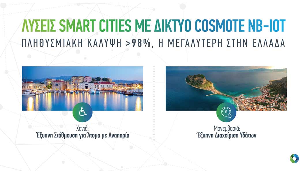 Λύσεις έξυπνων πόλεων υλοποίησε η COSMOTE στους Δήμους Μονεμβασιάς και Χανίων, αξιοποιώντας την τεχνολογία Narrow-Band Internet of Things (NB–IoT). Με την Έξυπνη Διαχείριση Υδάτων στη Μονεμβασιά και την Έξυπνη Στάθμευση στα Χανιά, διευκολύνεται η καθημερινότητα των πολιτών, ενώ οι δήμοι εξοικονομούν πολύτιμους πόρους και μειώνουν τις δαπάνες. Η υλοποίηση βασίστηκε σε τεχνολογία NB-IoT, καθώς απαιτεί μικρό όγκο δεδομένων για τη διασύνδεση συσκευώνμέσω δικτύου κινητής, μειώνοντας δραστικά την κατανάλωση ενέργειας και το κόστος.